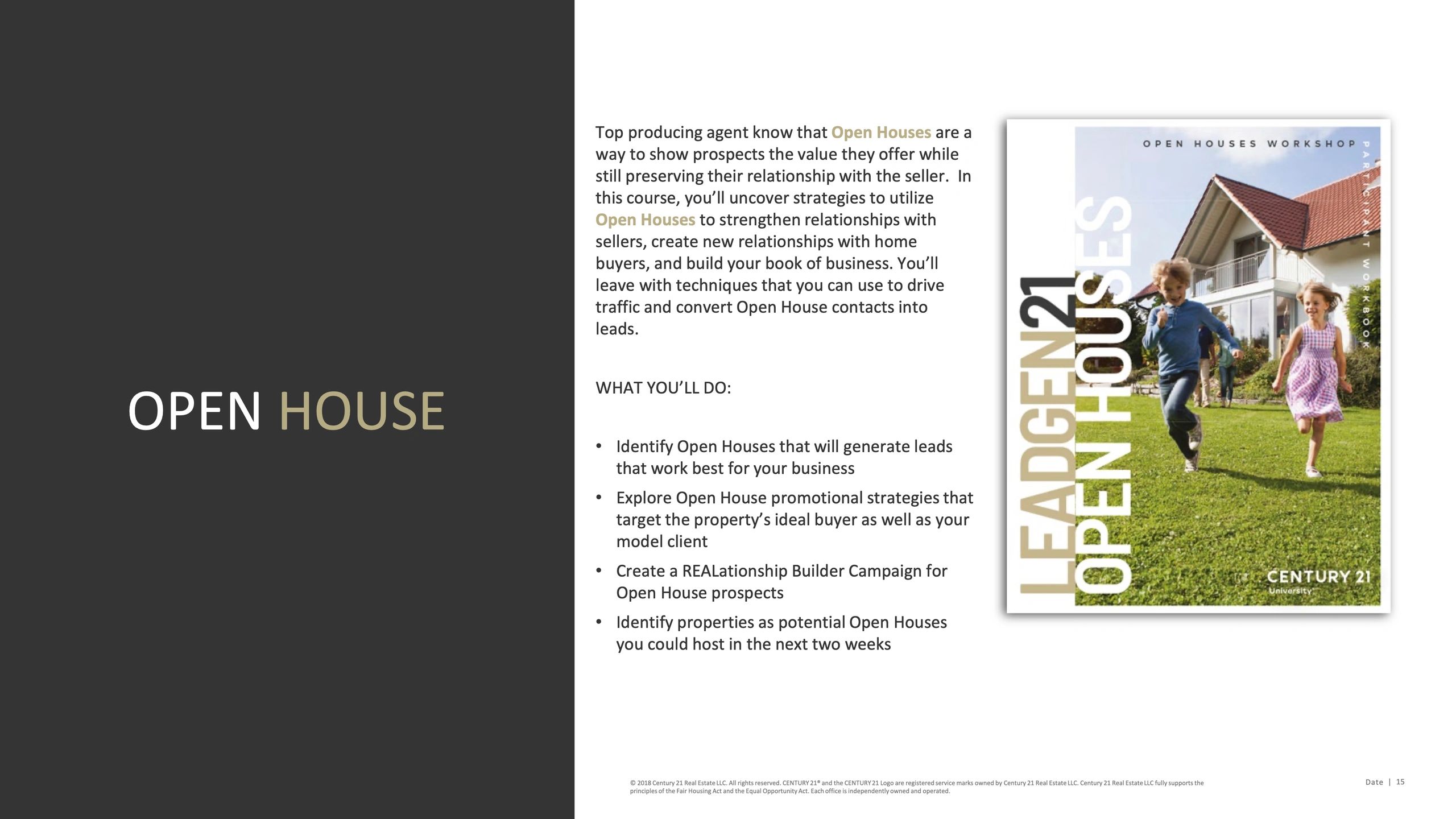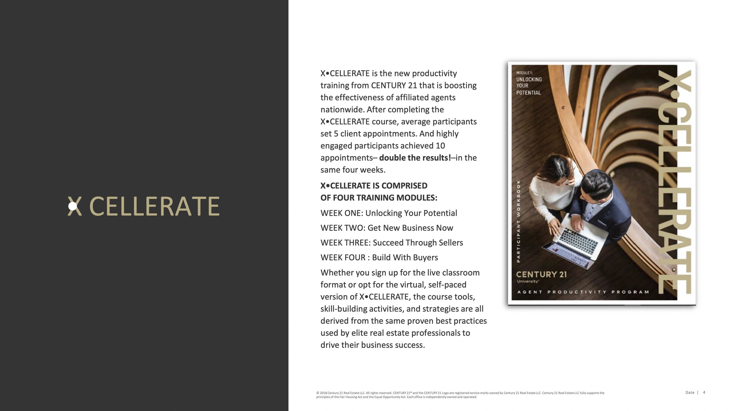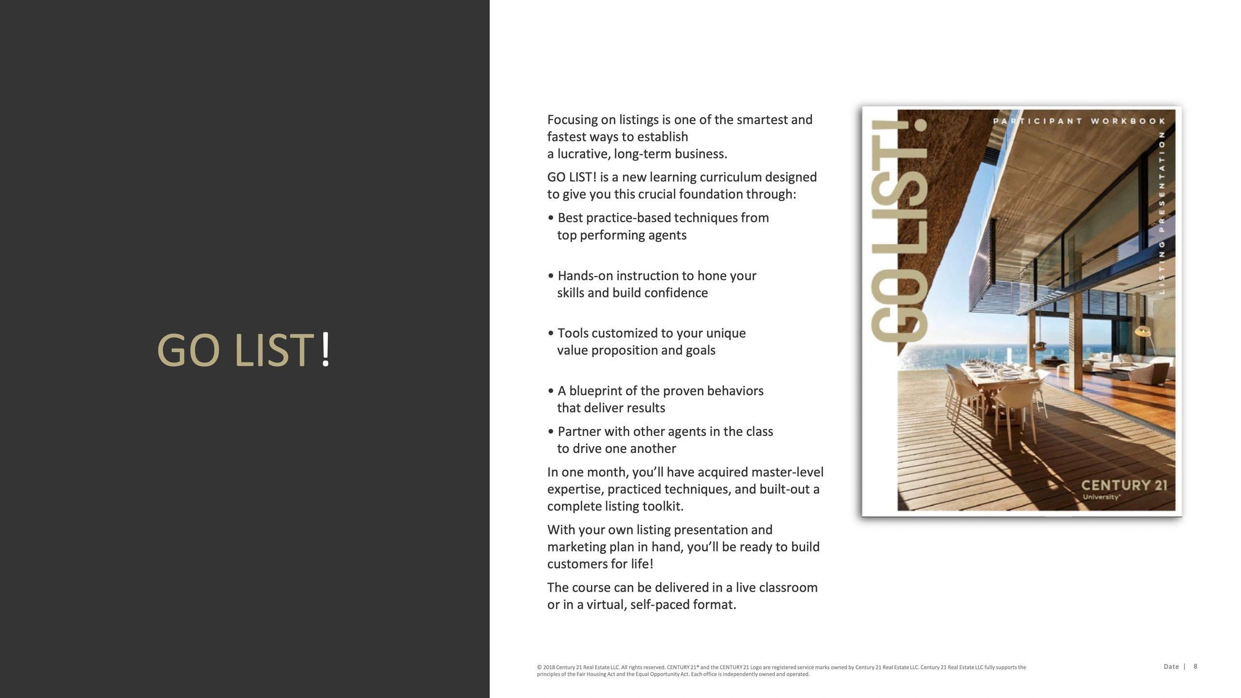 The Century 21® System’s GO LIST kicks off with a master class, followed by four weeks of DIY workshop instruction. Throughout these informative sessions, participants literally “learn by doing” through live demonstrations, skill-building exercises, and mini-tournaments that use friendly team competition to generate results in real time. GO LIST graduates will emerge from the course having crafted their own listings presentation, ready to grab market share, and confident in the art of signing sellers and establishing customers for life.