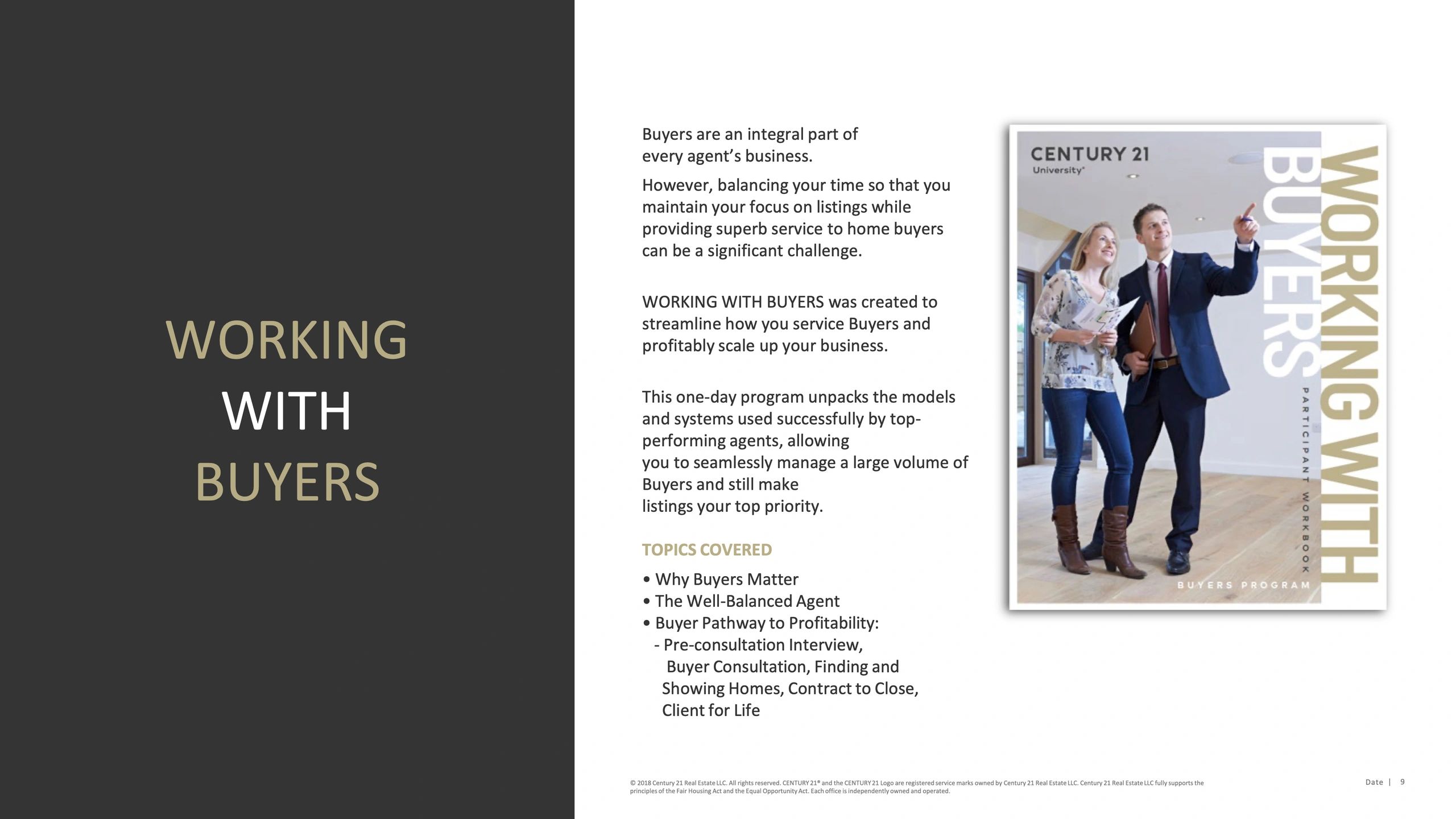 Working with Buyers is live course that delves into all areas of the home buying process. We start the day by reviewing your goals and business plan and then review your business mix as well as discuss how to avoid “buyer burnout.” We review the buying process, practice prospecting scripts, make calls to your sphere and review the Buyer Rep Agreement and the Buyer’s Agent Consultation. We’ll also cover the C21 brand tools that can help you save time and up your game. Get ready for the buying season!