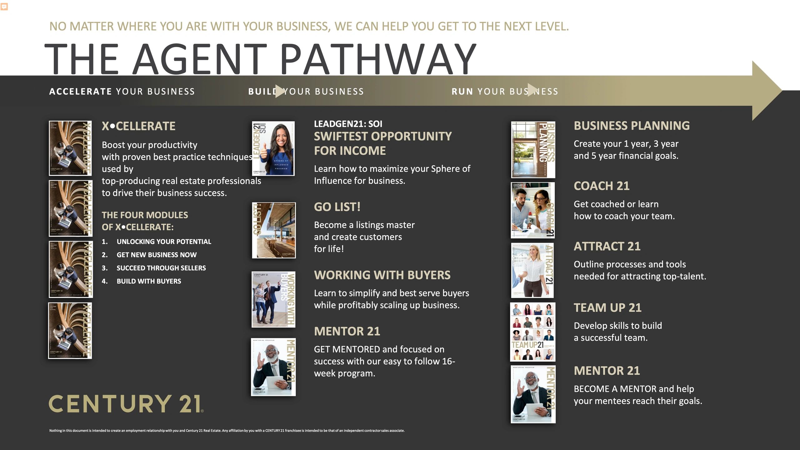 Professional development plays an important role in the success of CENTURY 21® sales associates. Our agents choose us because they see us as a pathway to their success through training and education. Whether we’re talking with a new agent who needs to learn the basics or we’re speaking with an experienced agent who wants to take their business to the next level, CENTURY 21 University can deliver the training that helps you achieve your goals while remaining affordable, accessible and effective.